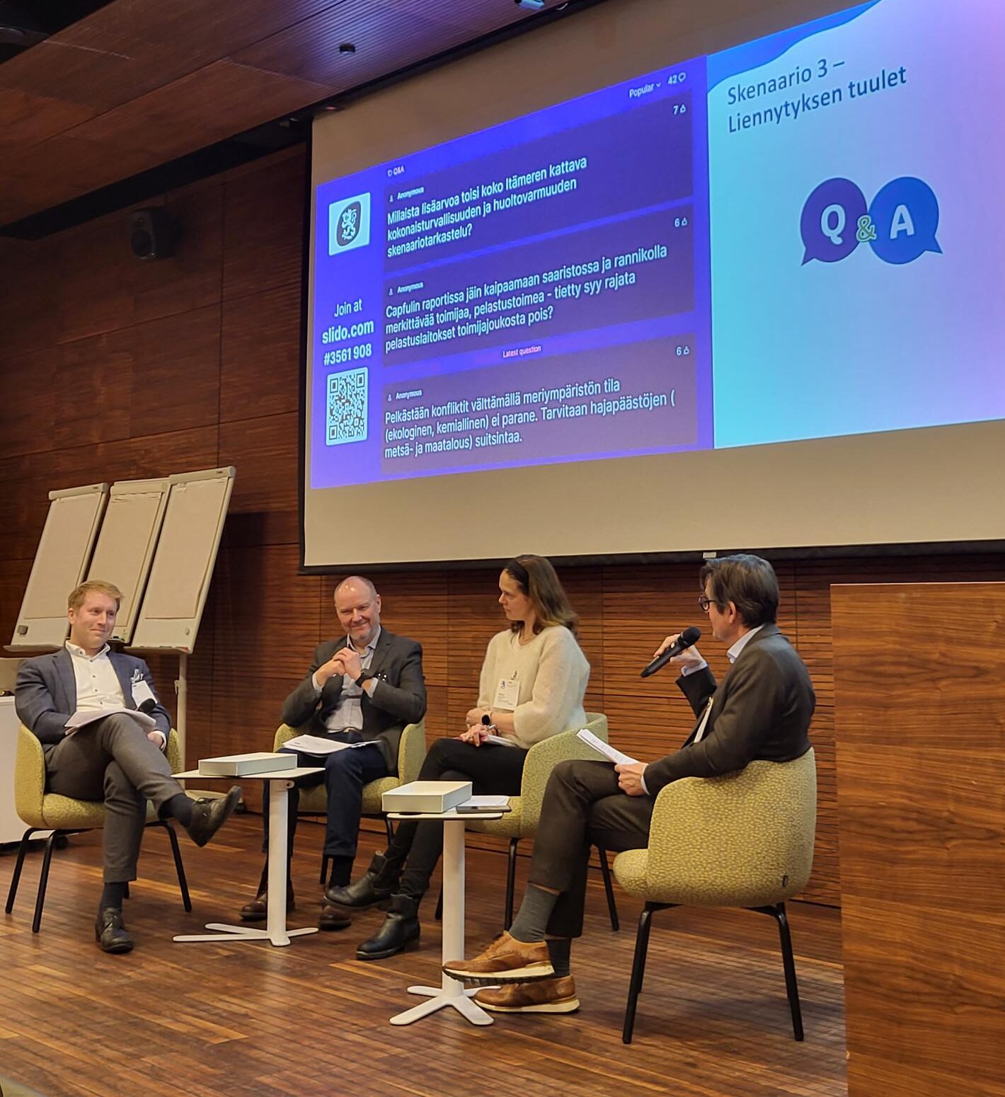 Kimmo Nepola (Fingrid), Heikki Lehtinen (MMM) and Maarit Mikkelsson (Traficom) acted as commentators in the session organised by the Maritime Spatial Planning Coordination Group. Frank Hering (Regional Council of Kymenlaakso) moderated the session.